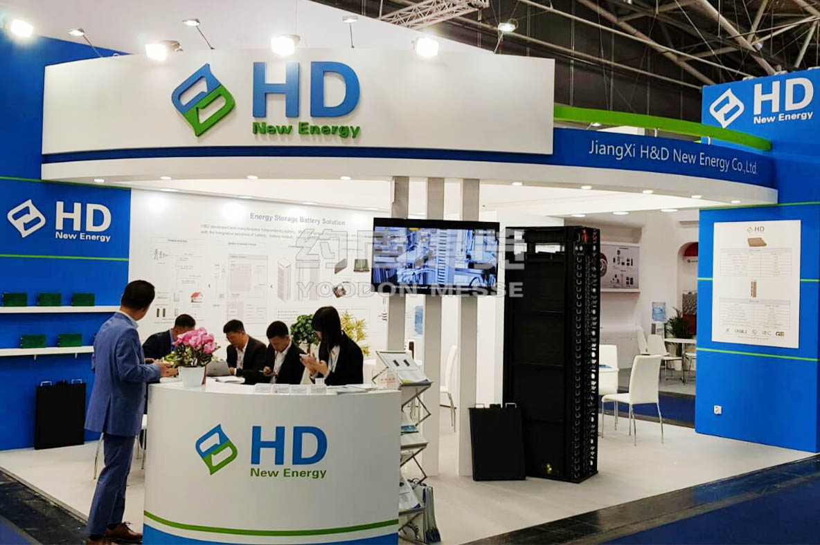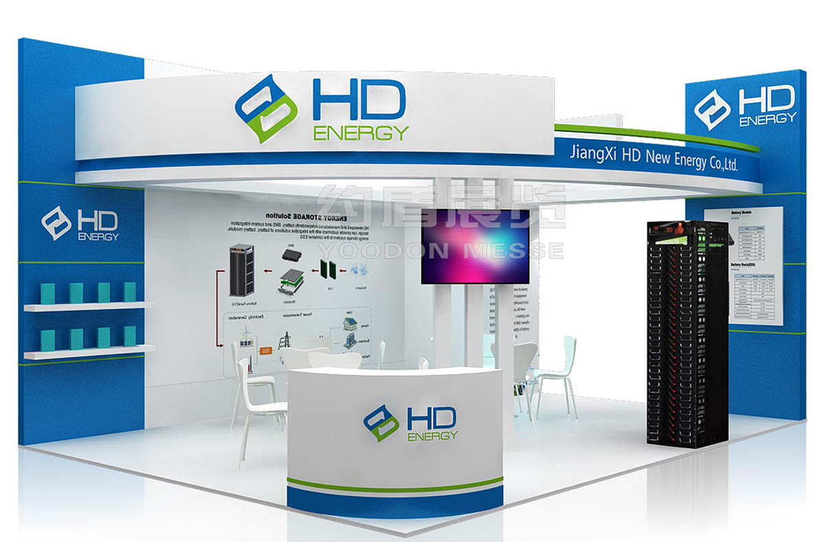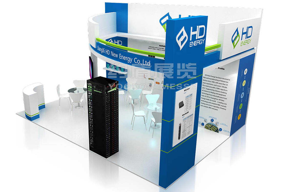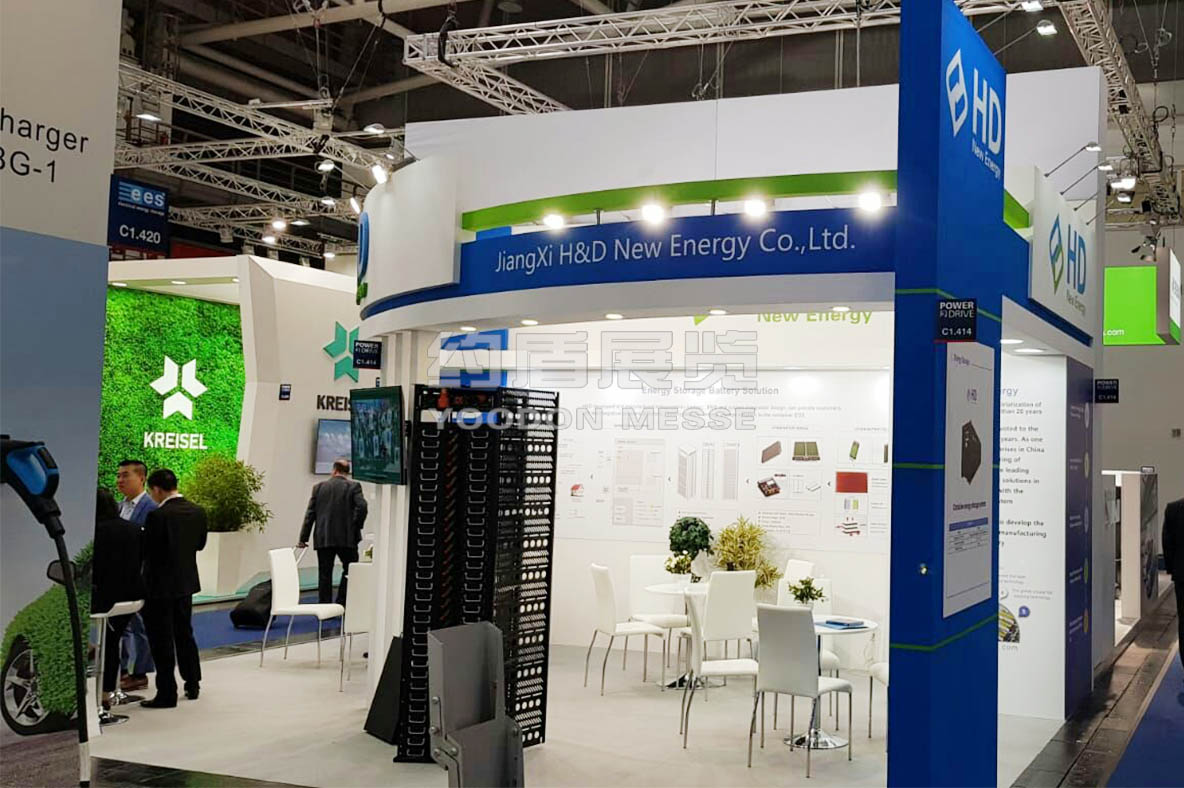 恒動新能源致力于研發與制造高安全、高能量密度、長壽命的鋰離子電池,產品已普遍應用于電動汽車領域(客車、物流車、低速車、房車等)和電池儲能領域(電力、鐵路、船舶、UPS及移動儲能等).恒動此次參加德國展臺設計搭建的風格主要圍繞企業主題來設計,綠色和藍色作為主基調,象征著環保節能的意思。